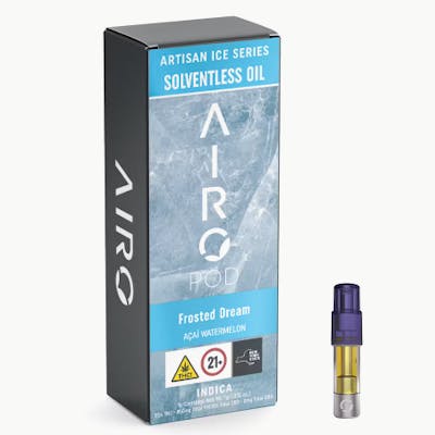 Escape into a cooler state of mind with Artisan Ice Series Frosted Dream by Airo Brands. Frosted Dream is an Indica cartridge that blends the icy acai and refreshing, crisp watermelon for a revitalizing, arctic experience. As you inhale, let the smooth and sweet notes of freshly juiced watermelon juice and tangy acai tantalize your palate. As you exhale, experience a refreshing escape, like a cool, gentle breeze. Feel calm and relaxed before a peaceful tranquil evening. -- Our Solventless Artisan Ice Series delivers smoother hits, bolder flavors, and unmatched purity - crafted with advanced extraction for a clean, elevated high. Crisp, icy flavors fuse with premium cannabis oil and natural botanical terpenes for a cooling twist. Expect vibrant fruit, delicate florals, and bold savory notes in every chilling, invigorating exhale.