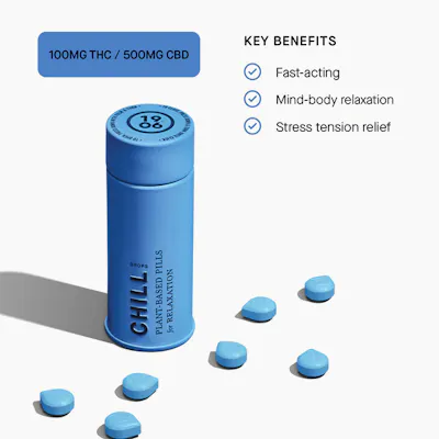 Chill promotes relaxation through a blend of cannabis, CBD, and plant medicine. Swallowable pills with rapid onset of 20 minutes. Vegan, calorie-free, sugar-free, and gluten-free.