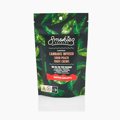 Sativa Sour Peach Fruit 100mg THC Fruit Chews Enhanced with botanical terpenes! Smokiez Sour Peach Fruit Chews are NOT YOUR AVERAGE FRUIT CHEWS™ ;) These fruit chews taste like fresh peaches picked right off the tree, with a tangy balance of fruity and citrusy notes. These delicious fruit chews are a tasty and discreet way for you to indulge! They are also made with plant-based ingredients, dairy-free, and contain NO high fructose corn syrup. Each of our mouth watering fruit chews contain 10 mg of THC, and made with our high clarity cannabis distillate for great taste. There are 10 pieces per package with 100 mg active THC per package. Smokiez 100mg THC Fruit Chews come in 3 delicious flavors and have both sweet and sour flavor profiles
