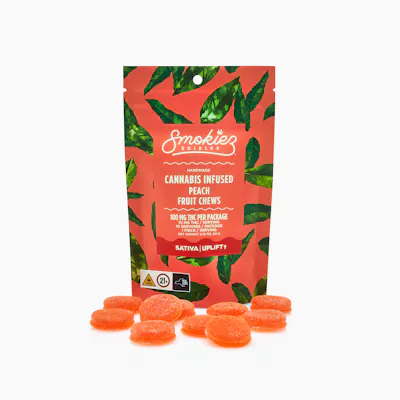 Sativa Peach 100mg THC Fruit Chews Enhanced with botanical terpenes! Smokiez Sweet Peach Fruit Chews are NOT YOUR AVERAGE FRUIT CHEWS™ ;) These fruit chews taste like fresh peaches picked right off the tree, with a balance of sweetness and fruity notes. These delicious fruit chews are a tasty and discreet way for you to indulge! They are also made with plant-based ingredients, dairy-free, and contain NO high fructose corn syrup. Each of our mouth watering fruit chews contain 10 mg of THC, and made with our high clarity cannabis distillate for great taste. There are 10 pieces per package with 100 mg active THC per package. Smokiez 100mg THC Fruit Chews come in 3 delicious flavors and have both sweet and sour flavor profiles