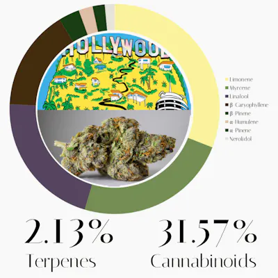 The terpene profile of this Hollywood strain suggests a multifaceted experience that balances bright, cerebral energy with deep, physical tranquility. The presence of Limonene as the primary terpene may offer an immediate sense of euphoria and mood elevation, potentially helping to cut through stress or mental fog with a zesty, citrus-forward lift. The significant concentration of Myrcene could introduce a grounding, soothing quality to the experience. This terpene may assist in easing physical tension and might promote a more sedated, “stoney” feeling as the initial brightness of the flower begins to settle into the body. Linalool adds a floral complexity to the profile, which may further enhance the calming properties of the strain. This component could be particularly helpful for those seeking a sense of serenity, as it may provide a gentle buffer against restlessness. The inclusion of beta-Caryophyllene suggests a spicy, functional layer that might offer unique physiological support. This terpene may interact with the body's systems to help manage physical discomfort, potentially grounding the more intense cerebral effects. beta-Pinene brings a crisp, refreshing element to the mix, which may help maintain a degree of mental clarity and alertness. This could prevent the heavier terpenes from becoming overly overwhelming, potentially keeping the consumer present and engaged. Finally, alpha-Humulene rounds out the top six, providing an earthy undertone that may act as a natural appetite suppressant. This terpene could contribute to the overall physical relaxation of the strain, potentially making it a suitable choice for unwinding during a quiet evening.