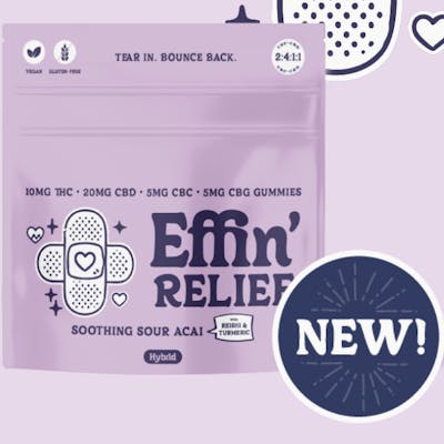 Give soreness and aches the middle finger! Effin’ Relief is packed with THC, CBD, CBC, and CBG all wrapped in a tangy Sour Acai bite of relief. Our gummies are also boosted with Reishi and Turmeric for a feel-good twist on your recovery routine. Effin’ Relief has your back, neck, and everything else.