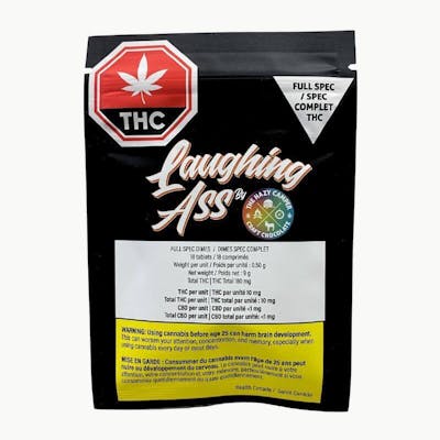 Weed for your tongue instead of your lungs. Laughing Ass brings you Full Spectrum THC oil infused tablets made of fat soluble cocoa butter. Enjoy the easy dosing 10 mg tablets that melt away in your mouth, with a mild and pleasing cannabis flavour.