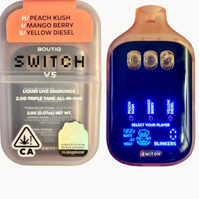 BOUTIQ SWITCH V5 (3 in 1) ”PEACH KUSH” (HYBRID) x “MANGO BERRY” (INDICA) x “YELLOW DIESEL” (SATIVA) Discover the Boutiq Switch V5 – a revolutionary advancement in the world of disposable vape pens! Featuring a pioneering three-chamber structure, this elegant device offers three unique, freshly crafted flavors in one handy package, enabling effortless transitions between them with each inhale. Designed for unparalleled enjoyment and ease, it's the latest essential from Boutiq, ideal for vape aficionados seeking diversity and top-notch quality while on the move. Enhance your vaping journey now! 2G DISPOSABLE 89.76% THC 3 FLAVORS IN ONE (SATIVA, HYBRID, INDICA) HOW TO USE: Single Strain Mode: Click button 1 time to select Dual Strain Mode: Click button 2 times to select Triple Strain Mode: Click button 3 times to select Infinity Mode: Click button 5 times to enable for one hit (use with caution!) ⚠️