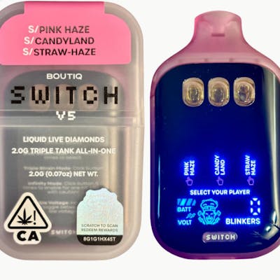 BOUTIQ SWITCH V5 (3 in 1) ”PINK HAZE” x “CANDYLAND” x “STRAW-HAZE” (SATIVA) Discover the Boutiq Switch V5 – a revolutionary advancement in the world of disposable vape pens! Featuring a pioneering three-chamber structure, this elegant device offers three unique, freshly crafted flavors in one handy package, enabling effortless transitions between them with each inhale. Designed for unparalleled enjoyment and ease, it's the latest essential from Boutiq, ideal for vape aficionados seeking diversity and top-notch quality while on the move. Enhance your vaping journey now! 2G DISPOSABLE 90.82% THC 3 FLAVORS IN ONE (SATIVA) HOW TO USE: Single Strain Mode: Click button 1 time to select Dual Strain Mode: Click button 2 times to select Triple Strain Mode: Click button 3 times to select Infinity Mode: Click button 5 times to enable for one hit (use with caution!) ⚠️