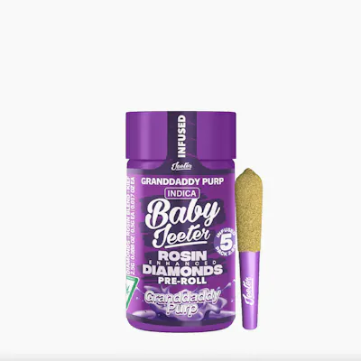 Granddaddy Purp - IndicaGranddaddy Purp is an indica strain that crosses Mendocino Purps, Skunk, and Afghani. As one might expect, its dense, compact buds are wreathed in deep purple leaves which darken as Granddaddy Purp reaches full maturation. It is named for its distinct, sweet grape-like aroma and flavor profile with a slight, spicy earth accent that carries over from its Afghani lineage.Effects: Relaxed, EuphoricJeeter’s Quad Infused Prerolls combine four layers working in sync for a maxed out infused experience. THCA diamonds add potency, rosin brings smooth, full spectrum depth, expertly crafted terpene profiles help shape the entourage effect while enhancing aroma, and a kief finish adds strength with a hand crafted touch. The result is a harder hitting experience with richer flavor that lasts longer.* Infused w/ THCA diamonds and rosin, dusted in kief* 5 x 0.5G Quad-Infused Minis totaling 2.5 Grams Per Pack