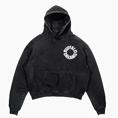 Washed black hoodie with a soft, worn-in feel. Features a small “Buffalo Dreams” logo on the chest. Simple, comfortable, and easy to wear every day.