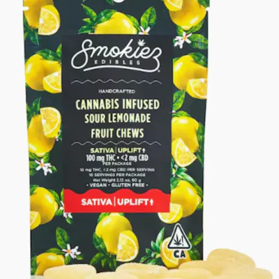 Smokiez Sour Lemonade Fruit Chews are award-winning, Sativa-dominant cannabis edibles featuring a tart, fresh-squeezed lemon flavor. These vegan, gluten-free, and dairy-free gummies contain high-clarity distillate. They are popular for providing an uplifting experience without high fructose corn syrup