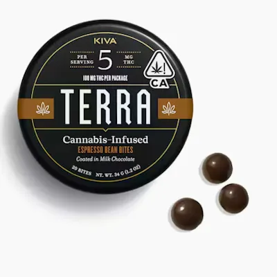 5mg THC per piece | 100mg THC total in 20 pieces Espresso Terra Bites are crafted from micro-roasted Tanzanian coffee beans coated in premium dark chocolate. Each bite is polished to rich, earthy, irresistible perfection. Our espresso beans are sourced from Bay Area, California favorite Andytown Coffee Roasters. Ingredients: Semisweet Chocolate (Sugar, Unsweetened Chocolate, Cocoa Butter, Potassium Carbonate, Sunflower Lecithin, Vanilla), Espresso Bean, Gum Arabic, Cannabis Extract, Cocoa Powder, Confectioner's Glaze, Natural Flavor, Sucrose, Glucose Syrup. Disclaimer: Because of the unique nature of the cannabis industry, each Kiva product is produced in the state in which it is sold. Accordingly, the content of THC and other cannabinoids may vary depending on which state you purchase your product. Similarly, the ingredients and allergens may also vary slightly by state. For the most accurate potency, ingredient, and allergen information, please refer to your product package.