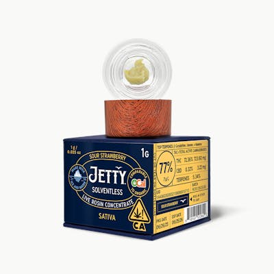" A cross of Strawberry Kush and Razzberry, this high THC award-winning strain has tasting notes of ripe berries and OG diesel fuel. Expect a pleasantly relaxing full-body high. Jetty Live Rosin starts with top-tier cultivars grown specifically for solventless extraction. Our premium sun-grown cannabis is harvested at the peak of ripeness and flash-frozen to preserve the natural terpenes and cannabinoids. Extracted entirely without chemicals, using just ice, water, heat, and pressure. This is premium-grade, first wash only Jetty Live Rosin. OCal is the comparable-to-organic program for cannabis grown and manufactured in California. OCal products are cultivated and extracted without pesticides, synthetic fertilizers, or bioengineering. Jetty takes the craft approach to concentrates with small batches made from premium fresh frozen cannabis. We aim for big flavor and broad terpene profiles, and never start out with a set menu. That means a variety of concentrate types like rosin, badder, sauce, sugar or diamonds, and quantities that may be limited." Terpenes: 5.34%