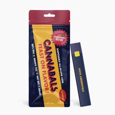 Indulge in the sweet and earthy flavors of CANNABALS Strawberry Kush! This sleek and discreet disposable vape pen offers a delightful blend of fruity and herbal notes. Each pen contains one gram of high-potency indica cannabis oil, expertly infused with the delicious taste of Strawberry Kush. Strawberry Kush is renowned for its luscious strawberry flavor with undertones of earthy kush. With CANNABALS, you can enjoy the full-bodied taste and aroma of this exquisite strain in a convenient and portable vape. It's a sensory experience that will delight your taste buds and calm your mind. 1g | All-in-One | Indica (88.00% THC)
