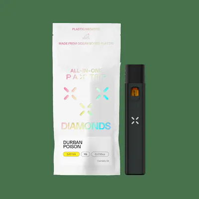 PAX Diamonds are the purest form of THC, the plant's most celebrated cannabinoid. High potency THC with Natural Terpenes. Durban Poison is an energizing sativa with citrus, spice, and subtle vanilla notes. Uplifting and creative - ideal for active days and inspired moments. 1G | All-In-One | Sativa Effects: Uplifting, Energizing Terpenes: ß-Myrcene, Terpinolene, Limonene