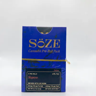 SÖZE – Slapaya – Live Resin Infused – 4pk (.75g) | Premium Infused Pre-RollsElevate your cannabis experience with SÖZE Slapaya Live Resin Infused 4pk (.75g), a premium infused pre-roll pack crafted for bold flavor, smooth smoke, and enhanced potency. Combining high-quality flower with terpene-rich live resin, this product delivers a flavorful and powerful session in a convenient multi-pack format.Product OverviewSÖZE Slapaya pre-rolls are infused with live resin to boost both potency and terpene expression. Infused pre-rolls combine cannabis flower with concentrates, resulting in a stronger and more flavor-forward experience compared to traditional joints. This 4-pack (.75g total) offers portability and convenience, making it ideal for quick sessions or sharing.Strain OverviewSlapaya is a hybrid strain known for its vibrant terpene profile and balanced effects. It delivers a mix of uplifting mental clarity and relaxing body sensations, making it a versatile option for various occasions.What is Live Resin Infused Flower?Live resin is made from fresh-frozen cannabis, helping preserve the plant’s natural terpenes and cannabinoids for enhanced flavor and aroma. When infused into pre-rolls, it creates a more potent, aromatic, and long-lasting experience compared to standard flower.Aroma & Flavor ProfileExpect a tropical and fruity aroma with hints of citrus, sweet berries, and subtle earthy undertones. The flavor is smooth and juicy on the inhale, followed by a slightly tangy, creamy finish that lingers pleasantly.Effects & ExperienceSlapaya Live Resin Infused pre-rolls provide a balanced high that begins with an uplifting cerebral buzz, promoting a positive and social mood. As the effects settle, a calming body relaxation follows, making it suitable for both daytime enjoyment and evening unwinding depending on tolerance.Product Highlights4-pack infused pre-rolls (.75g total)Enhanced with live resin for increased potency and flavorHybrid strain with balanced, versatile effectsTropical, fruity terpene profileSmooth, convenient, ready-to-use formatWhy Choose SÖZE Slapaya Live Resin Infused Pre-Rolls?If you're searching for infused pre-rolls in New York, live resin pre-roll packs, or high-potency cannabis joints, this product stands out for its combination of flavor, strength, and convenience. It’s an excellent choice for users looking to elevate their experience beyond standard flower.Perfect ForOn-the-go cannabis sessionsSocial sharing or solo enjoymentUsers seeking stronger, infused productsFans of fruity, terpene-rich strainsShop SÖZE Slapaya Live Resin Infused 4pk (.75g) at Cannabis Realm of NY and enjoy a potent, flavorful, and expertly crafted infused pre-roll experience designed for smooth and satisfying sessions.