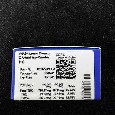 The #HASH Lemon Cherry x Z Animal Wax Crumble is a balanced hybrid concentrate combining bright citrus sweetness with creamy, earthy undertones. Its terpene-rich profile delivers smooth, flavorful dabs and a calming yet euphoric high, great for day or night use.Product Highlights:Strain Type: HybridFormat: 1g Wax Crumble