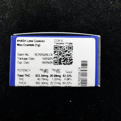 The #HASH Lime Cookies Wax Crumble blends zesty lime flavor with the sweet, doughy notes of classic cookies for a flavorful hybrid experience. Expect uplifting cerebral effects balanced by a smooth, relaxing body high, ideal for creative or mellow moments.Product Highlights:Strain Type: HybridFormat: 1g Wax Crumble