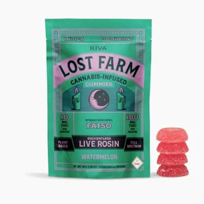 Lost Farm | Watermelon × Fatso Live Rosin Gummies | 100 mg (10 ct) Sweet watermelon meets the pungent, herbal notes of the indica-dominant Fatso strain in these live rosin‑infused gummies. Each vegan chew delivers 10 mg THC, for a total of 100 mg per pack, offering a full-spectrum, strain‑specific experience that's both flavorful and deeply relaxing. Fatso brings earthy coffee and pine notes while Watermelon adds refreshing fruit sweetness for a balanced, mellow high