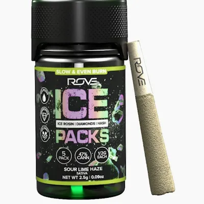 The Rove "Sour Lime Haze" is a sativa-leaning strain, known for its energizing and uplifting effects. It is offered as a triple-infused pre-roll called an "Ice Pack," which is made with a combination of premium flower, THCA diamonds, and rosin.