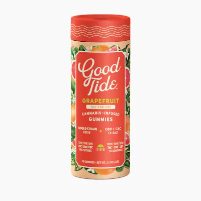 Good Tide Grapefruit THC:CBD:CBC gummies pair a Sativa single-strain rosin with the mood-boosting effects of CBC for citrusy, decadent treat that will get you a front row seat to bliss.​ -- 10mg THC:CBD:CBC per gummy, 100mg THC:CBD:CBC per container. -- Made with fully compostable packaging!