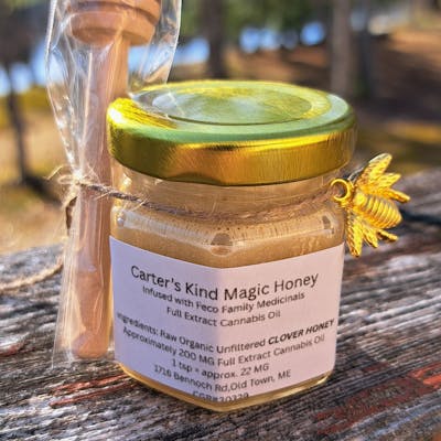We are very excited to announce our latest concoction, Carter's Kind's Magic Honey. We have partnered with Matt from FECO Family Medicinals to bring you a product that you won't find anywhere else. We start with Raw, Organic Unfiltered Clover Honey, which has been shown to have numerous health benefits. It is loaded with Antioxidants and Vitamins. It has been proven to be an effective cough suppressant, and it is also an all natural anti-inflammatory. Then we cold infused it with the best Full Extract Cannabis Oil in the State, made by FECO Family Medicinals. The result is a thing of beauty!! Each 1.5 oz jar contains approximately 200 mg of Pure Cannabis Oil, and it works out to roughly 22 mg per teaspoon. It's a great way to start you day by sweetening your coffee or tea, spreading it on your toast, and having a spoonful straight up! Also an excellent way to unwind after a long day. The possibilities are endless with Carter's Kind's Magic Honey!! We make this in very small batches, and supplies are limited!!