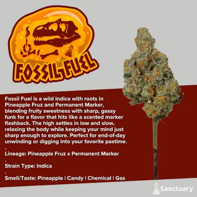 Fossil Fuel is a wild indica with roots in Pineapple Fruz and Permanent Marker, blending fruity sweetness with sharp, gassy funk for a flavor that hits like a scented marker flashback. The high settles in low and slow, relaxing the body while keeping your mind just sharp enough to explore. Perfect for end-of-day unwinding or digging into your favorite pastime. Lineage: Pineapple Fruz x Permanent Marker Strain Type: Indica Smell/Taste: Pineapple | Candy | Chemical | Gas Sanctuary provides the finest grade cannabis. Our products are organically produced and laboratory tested for safety, potency, and consistency.