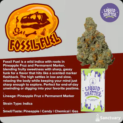 Fossil Fuel is a wild indica with roots in Pineapple Fruz and Permanent Marker, blending fruity sweetness with sharp, gassy funk for a flavor that hits like a scented marker flashback. The high settles in low and slow, relaxing the body while keeping your mind just sharp enough to explore. Perfect for end-of-day unwinding or digging into your favorite pastime. Lineage: Pineapple Fruz x Permanent Marker Strain Type: Indica Smell/Taste: Pineapple | Candy | Chemical | Gas Sanctuary's proprietary Liquid Shatter is a full-spectrum cannabis oil that retains all the beneficial properties of the original plant and delivers a clean vaping experience and taste without the addition of any cutting agents, flavors or additional terpenes. It's not a distillate product–we like to think of it as Dabs On Demand. Marijuana Vaporizer Devices have been tested for Vitamin E Acetate and other contaminants, with no adverse findings. WARNING: Vaporizer Devices may contain ingredients harmful to health when inhaled Consumers shall have access to the test results of Marijuana Vaporizer Devices including copies of any Certificates of Analysis provided by the device's manufacturer.