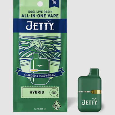 "Jetty 100% Live Resin has a whole new look. We’ve improved oil clarity, boosted the potency, and sharpened the flavor for a whole new experience. We removed the fats and waxes that clog your vape, ensuring a smooth smoke from start to finish. With our specialized purification processes, every puff delivers the true essence of the plant, offering a pure and bold flavor that stays great all the way to the end of your cart. Jetty Extracts invites you to explore, rise, and TAKE FLIGHT with our expertly crafted 100% Live Resin. Now ECCO Certified. Look for the Jetty signature upcycled wood tip and our premium EVOmax Ceramic CCell cartridges. Customize your temp with any 510-thread battery. "