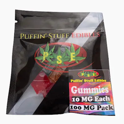 100mg mixed flavor gummies made with distillate by Puffin Stuff Edibles.