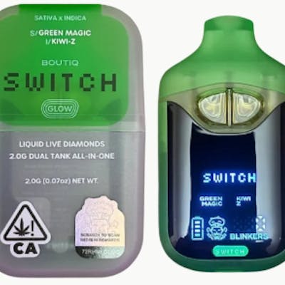 The New Glow Edition adds an extra layer of flair to your vaping experience with its unique glow-in-the-dark feature. Both the case and the vape illuminate brilliantly in low-light conditions, transforming your device into a striking accessory. Whether you’re in a dimly lit room or out under the stars, the Glow Edition ensures you’ll stand out with its captivating glow, enhancing both style and functionality. Discover a new dimension of vaping pleasure with the Boutiq Switch Glow Edition, featuring the dynamic duo of Green Magic (Sativa) and Kiwi – Z (Indica). This dual-tank all-in-one disposable pen offers a seamless blend of invigorating energy and soothing calm, wrapped up in a stylish and portable design. Green Magic (Sativa) enchants with its vibrant, herbal notes and a touch of citrus, providing an uplifting and refreshing experience perfect for boosting creativity and focus. On the other hand, Kiwi – Z (Indica) introduces a smooth, fruity flavor with a hint of earthiness, offering a gentle pathway to relaxation and tranquility. Together, these strains create a harmonious balance that caters to both active and restful moments. Engineered for excellence, the Glow Edition is infused with Liquid Live Diamonds technology, ensuring each draw is exceedingly pure, potent, and smooth. Its innovative 2g dual-tank design allows you to enjoy the distinct characteristics of both strains in one sophisticated device, delivering a consistently delightful experience wherever your journey leads. Total THC: 92.35% 2 Grams Liquid Live Diamonds Sativa-Indica Blend (2 in 1) Rechargeable