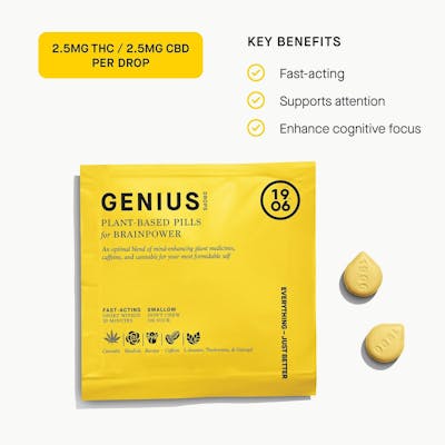 Tap into your genius with the only edible developed specifically to enhance focus. The combination of plant medicines Rhodiola, Theobromine, Galangal, Bacopa, L-Theanine with cannabis promotes cognitive focus, memory enhancement, and calm concentration. Swallowable pills with a rapid onset of 20 minutes. Vegan, calorie-free, sugar-free, and gluten-free. Each Genius Drop contains 2.5mg THC, 2.5mg CBD, and 2.5mg CBG.