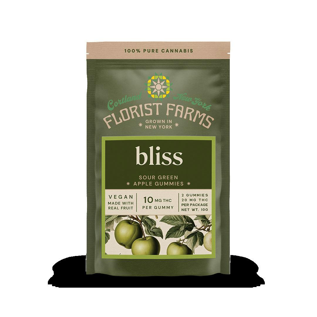 Bliss Sour Apple Gummies | 2-PackAbout This ProductThese vegan gummies are made with real fruit and organic ingredients. If you’re looking for a gummy that actually tastes good, these are a top pick. They are genuinely some of the best gummies we’ve tried. Experience the perfect high with Florist Farms' Sour Green Apple gummy. Made with real apple juice, this gummy blends tangy flavor with 10mg of THC, delivering a euphoric experience.Dose: 10mg THC per gummy (Easy to split in half for a 5mg dose)Quantity: 2 GummiesFlavor: Tart and tangy sour appleEffects: Balanced, easy, euphoric highIngredients: Organic Tapioca Syrup, Sugar, Water, Organic Juice Concentrate, Fruit Pectin, Natural Flavoring, Citric Acid, Sodium Citrate, THC Distillate, Malic Acid, Natural Colors, Organic Sunflower OilWhy We Love Florist Farmslocated in Cortland, NY, Florist Farms is committed to sustainability. They practice regenerative farming by growing in living soil, using organic compost, and never use pesticides. For over a decade they have been organic vegetable farmers and donate produce weekly to help support their community. Our friends at Florist Farms are deeply committed to quality and to delivering the cleanest cannabis products in New York State.Vegan • No Artificial Flavoring or Dyes • No Corn Syrup • Dairy Free • Gluten Free • Soy Free • Tree-Nut Free • Coconut Free