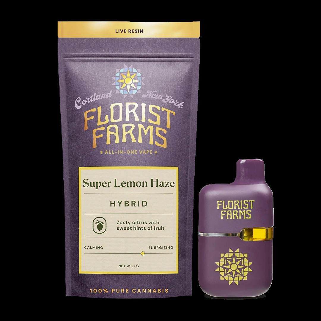Super Lemon Haze | Hybrid | Pure Live Resin | All-In-One-Vape | 1G About This Product Live Resin is the closest you can get to tasting the plant exactly as it was at the moment of harvest. The flower is frozen fresh to preserve its full terpene and cannabinoid profile, resulting in a more flavorful and full spectrum experience. We love this vape from Florist Farms because it has a ceramic core and burns at just the right temp for a smooth hit every time. Effect: Hybrid Flavor: Zesty citrus with sweet hints of fruit Ingredients: 100% Pure Live Resin Why We Love Florist Farms Located in Cortland, NY, Florist Farms is committed to sustainability. They practice regenerative farming by growing in living soil, using organic compost, and never using pesticides. For over a decade, they have been organic vegetable farmers and donate produce weekly to help support their community. Our friends at Florist Farms are deeply committed to quality and to delivering the cleanest cannabis products in New York State. 100% Pure Live Resin • No Distillate • Small Batch • Ceramic Core • USB-C Rechargeable