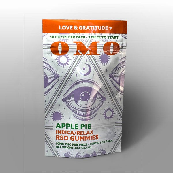 10 10mg THC Gummies in each Package, 100mg Total Like a bite of fresh-baked comfort, our award winning* Apple Pie RSO Gummy not only hits different, it hits it out of the park! With nostalgic flavors that warm the soul, where sweet yet tangy green apple meets a touch of savory cinnamon, it brings you right back home to that cozy, feel-good place. Infused with our signature full-spectrum RSO, these gummies deliver a deep, full-body indica experience that’s as relaxing as it is uplifting. Expect out-of-this-world flavor and effects — no oven required. Crafted with natural fruit juices for clean-label, true-to-fruit flavor and color; each pack of these bite sized wonders includes 10 perfectly dosed gummies at 10mg THC apiece. At OMO Labs, every creation is made with intention, love, and gratitude, ensuring the highest standards of quality, care, and consistency. Enjoy the vibe — enjoy OMO. *Why OMO RSO? Pure. Potent. Purposeful. At OMO Labs, we honor the legacy of Rick Simpson Oil (RSO) by crafting a true full-spectrum blended extract designed to deliver the complete power of the plant — cannabinoids, terpenes, and flavonoids working together in perfect harmony. The result is a deep, full-body experience that’s as elevating as it is therapeutic. Full Spectrum. Full Feels. Full You. * 1st Place Edible (Gummy) – 2024 Long Island Cannabis Cup (LICC)