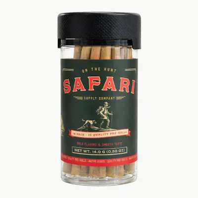"At Safari Supply Co., We're always on the hunt. From the hills of Humboldt to the back roads of California Cannabis. We track down legacy strains. Grown by farmers who work the land with grit and pride. Rolled fresh our Pre Rolls bring bold flavor and every day value straight from the field to your hands.14 count of 1g Pre Rolls."