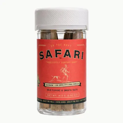 "At Safari Supply Co., We're always on the hunt. From the hills of Humboldt to the back roads of California Cannabis. We track down legacy strains. Grown by farmers who work the land with grit and pride. Rolled fresh our Pre Rolls bring bold flavor and every day value straight from the field to your hands.14 count of 1g Pre Rolls."