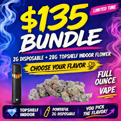 Get a full 28G of topshelf indoor flower paired with a powerful 2G disposable vape — all for just $135.