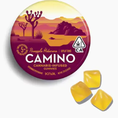 5mg THC per piece | 100mg THC total in 20 pieces A physical road takes you to a physical place. Camino (“road” in Spanish) takes you to a state of mind. Get a taste of the Southwest and invigorate your senses. Kiva’s Pineapple Habanero Camino gummies pair energy-stimulating sativa terpenes with ripe pineapple and a touch of heat. TERPENES: • Limonene - Reduces stress, alleviates asthma and allergies, reduces inflammation, and acts as an antioxidant. • Beta-Caryophyllene - May assist with the body's response to anxiety and stress. • Linalool - Anti-anxiety and sedating effects. • Alpha-Pinene - Improves attention span to deliver a more lucid and focused experience. INGREDIENTS: Organic Tapioca Syrup, Sugar. Gelatin, Malic Acid, Natural Flavors, Citric Acid, Cannabis Extract, Fruit and Vegetable Juice for Color, Natural Terpenes, Coconut Oil, Carnauba Wax Gluten-Free and Dairy-Free