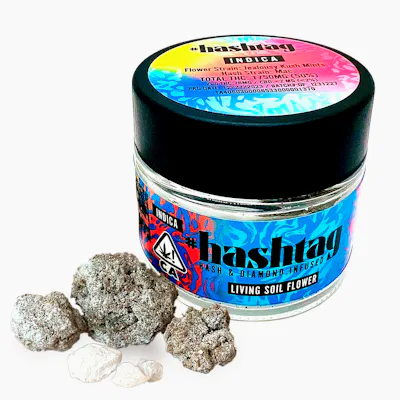 Hashtag – Nimbus Snacks w/ Haze Berry Hash (3.5g) — A high-potency, THCA-infused flower combining premium dry flower with Haze Berry hash and a dusting of THC-A powder for an extra kick. Each eighth features a unique blend of two strains, delivering a layered terp profile with notes of sweet berries, light citrus haze, and a subtle earthy finish. The smoke is rich and flavorful, with a smooth inhale and a slightly sweet, hashy exhale. Effects hit strong and fast—bringing an uplifting, euphoric head high followed by a heavy, relaxing body feel. Perfect for experienced smokers looking for a potent, next-level session.
