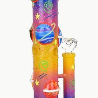 Get ready to blast out of orbit with the Orbiting Planets Glow in the Dark Water Pipe! This colorful borosilicate glass and enamel water pipe stands 13.75 inches (34.9cm) tall. The pipe is decorated with a vibrant constellation of planets on a nebula background, with glow in the dark accents and a 3 pinch ice catcher for rapidly cooling smoke. Includes a 19mm male herb slide. Highlights 13.75 inches tall Glass and enamel water pipe Straight rig style build Orbiting planets design Glow in the dark accents Inline percolator 3 pinch ice catcher Includes 19mm male herb slide