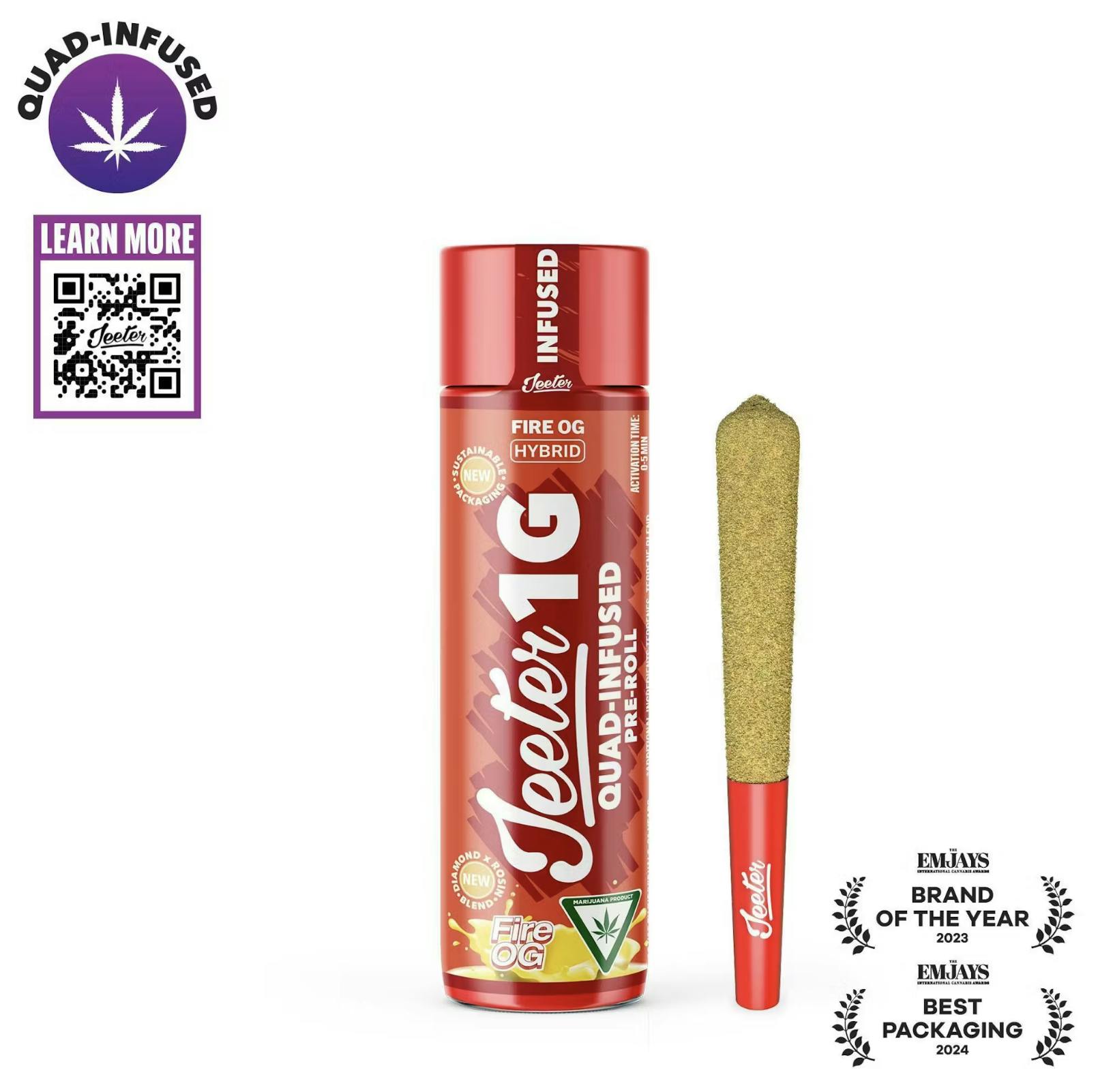 Fire OG - HybridFire OG is an indica-dominant hybrid strain, a product of its OG Kush and SFV OG Kush lineage. This strain has an aroma similar to Lemon Pledge and offers a citrusy, sweet and spicy flavor. Fire OG has potent and long lasting euphoric effects. The strain gets its very appropriate name from the frosty red hairs that make the strain appear to look like it is on fire.Effects: Relaxed, EuphoricJeeter’s Quad Infused Prerolls combine four layers working in sync for a maxed out infused experience. THCA diamonds add potency, rosin brings smooth, full spectrum depth, expertly crafted terpene profiles help shape the entourage effect while enhancing aroma, and a kief finish adds strength with a hand crafted touch. The result is a harder hitting experience with richer flavor that lasts longer.* Infused w/ liquid diamonds and rosin, dusted in kief* 2g XL Quad-Infused Joint w/ glass tip