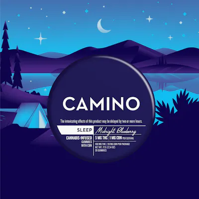 1mg CBN per gummy | 20mg CBN per package A physical road takes you to a physical place. Camino (“road” in Spanish) takes you to a state of mind. Settle in for a smooth slumber in a cozy lake cabin and let all your worries go. Our Midnight Blueberry gummies use relaxing terpenes with a hint of chamomile and lavender for a soothing, restful effect that's boosted by a key ingredient - CBN. PROCESSED IN A FACILITY THAT ALSO PROCESSES MILK, SOY, PEANUTS, & TREE NUTS.