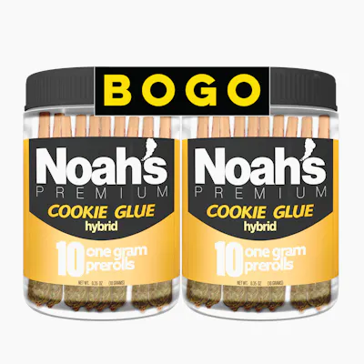 Experience the ultimate mood boost with Noah's Premium BOGO 10pk Cookie Glue. A product of crossbreeding Cookies with Glue Bx2, Cookie Glue is an evenly balanced hybrid marijuana strain known for its potent, euphoric high that can uplift even the dullest of moods. Packaged in a 10 pack, each preroll is infused with the subtly spicy and sour flavors of the hybrid strain, balanced by a hint of skunk and the sweet, comforting undertones of fruit. All these components deliver a multisensory experience beyond the average cannabis preroll.