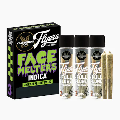 Catch a face melting fade with a Flyers Face Melters Flight Pack. This indica flight includes three (3) different strains in a box and two (2) half gram pre-polls for every strain, made from premium indoor full nug flower. Try a variety of three different body melting indica strains.