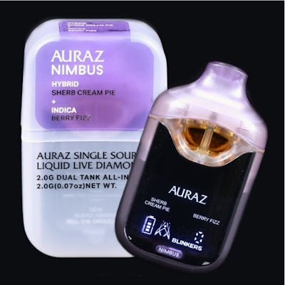 The Auraz Nimbus is a 2g dual-chamber Liquid Diamond disposable designed for precision and consistency, equipped with a digital display and usage tracker so you can enjoy every hit with confidence. This release pairs Sherb Cream Pie (H) with Berry Fizz (I), blending rich dessert flavors with bright berry freshness for a flavorful indica-leaning experience.