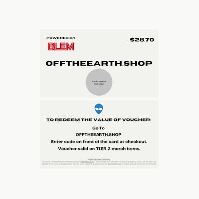 Unleash your shopping spree with Off the Earth Coupon Vouchers! Redeem these cards at OFFTHEEARTH.SHOP on a selection of unique accessories. Off the Earth offers a handpicked collection that’s out of this world. Perfect for gifting or treating yourself to something truly extraordinary! ✨ Ready to explore? The adventure starts now with your Off the Earth Voucher 🌎🛍 **NOT REDEEMABLE ON FROMTHEEARTH.COM** ***THIS VOUCHER SI REDEEMABLE ONLY FOR MERCHANDISE PURCHASES ON WWW.OFFTHEEARTH.SHOP - IT DOES NOT EXPIRE, IS NON-REFUNDABLE, AND CONOT BE EXCHANGED FOR CASH OR CREDIT. THE SELLER IS NOT RESPONSIBLE FOR LOST, STOLEN, OR DAMAGED VOUCHERS. USE OF THIS VOUCHER IS SUBJECT TO ALL APPLICABLE LAWS. VISIT WWW.OFFTHEEARTH.SHOP FOR COMPLETE TERMS AND CONDITIONS AND MORE INFORMATION***