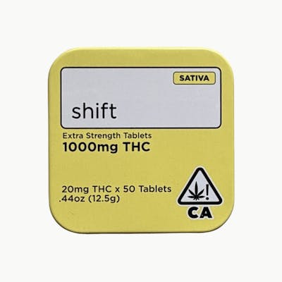 SHIFT – Sativa Extra Strength Tablets | 1000mg THC -- For seasoned cannabis users seeking a bold, energizing effect, SHIFT's Sativa Extra Strength Tablets deliver precision and power in every dose. Each tablet contains 20mg of THC from a full-spectrum cannabis extract, enhanced with natural sativa terpenes for a bright and uplifting experience. These unflavored tablets are easy to take—just swallow with water and feel the effects kick in fast. Exclusively available at From The Earth in Santa Ana, CA, you can either stop by the dispensary or opt for convenient home delivery. Crafted for experienced consumers, this high-dose option offers a clean, discreet, and efficient way to enjoy potent sativa effects without the need for smoking or vaping. Whether you're powering through a creative project or looking for a cerebral lift, SHIFT's 1000mg Sativa Tablet Tin is a reliable and robust choice.