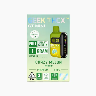 ššØ Crazy Melon All-In-One Disposable Bar 1G ā Geek THCX šØš Crazy Melon by Geek THCX is a premium all-in-one disposable vape delivering a juicy, tropical melon explosion in a smooth, easy-to-use device. Built for convenience and flavor, this 1G disposable offers consistent performance and bold terpene-rich hits from the first puff to the last. Expect a wave of sweet melon flavor on the inhaleāthink cantaloupe and honeydew blended with candy-like tropical notesāfollowed by a smooth, refreshing finish that keeps the profile light, juicy, and clean without being harsh or artificial. šāØ The effects are uplifting, euphoric, and mood-boosting, paired with a gentle body relaxation that keeps things easygoing and functional. Itās a solid choice for daytime use, social sessions, or anytime you want a happy, fruity lift without heavy sedation. ā”šæ Crafted by Geek THCX, this all-in-one disposable combines potency, flavor, and portability in a sleek device designed for effortless enjoyment wherever you go. Available for pickup at From The Earth in Santa Ana or delivery straight to your door. ššØ Enjoy the sweet tropical rush of Crazy Melon All-In-One Disposable Bar 1G ā Geek THCX.