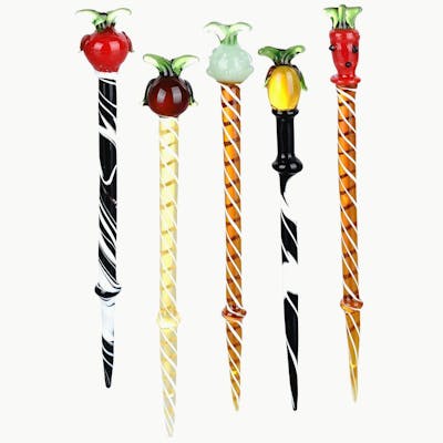 These Striped Fruit Glass Dab Tools are made from quality borosilicate glass and measure 5.5 inches (14cm) long. The tools have spiral stripes and a pointed tip, and they are topped with a decorative glass fruit topper.
