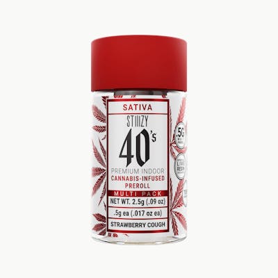 Stiiizy is setting the standard in the pre-roll game with the most revolutionary and innovative products. Elevate your pre-roll game.Stiiizy 40s pre-rolls are setting the standard with high potency, cannabis infused joints coated evenly with kief. Using our proprietary live resin infusion methods, we’ve designed every pre-roll to offer 40%+ THC potency with a unique flavor profile. With a smooth inhale and tasteful exhale, each and every Stiiizy 40 is packed with indoor grown flower, specifically made to ensure a potent and long-lasting high. Spark up the 40s. STRAWBERRY COUGH TASTE: Sweet, Strawberry, Fruity FEELING: Creative, Energizing, Euphoric DESCRIPTION: A cross between Strawberry Field and Haze. Strawberry Cough brings a thoughtful and energetic high that is perfect for conversation, reading, or working. Flavors Strawberry Sweet Flowery