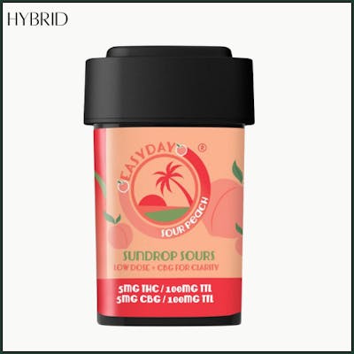 EasyDay Sundrop Sours – Sour Peach Product Type: Edible Gummy (5mg THC: 5mg CBG per chew / 100mg THC: 100mg CBG total) Strain Type: Hybrid-Infused Feel Good. Stay Clear. Buzz All Day. Sour Peach Sundrop Sours are your go-to for daytime clarity and mellow elevation. Each low-dose gummy combines 5mg THC and 5mg CBG in a balanced blend designed for smooth, functional effects—perfect for focused energy without the fog. With bright peach flavor and a tart citrus twist, they taste like sunshine and feel just as good. Flavor & Feel: Juicy peach meets tangy citrus for a sweet-sour spark Gentle buzz with light body calm and a lifted headspace All-day balance without overstimulation What to Expect: Mild body ease and focused clarity Mood support that stays smooth and steady Lightly energizing without the jitters Great For: Daytime microdosing or productivity breaks Creative work, errands, or easy social hangs Staying calm and uplifted when it counts Why You’ll Love It: Low-dose, big vibe. These Sundrops deliver feel-good clarity and peachy calm—designed to keep your mood sweet and your day steady What is CBG? CBG (Cannabigerol) is often called the “mother cannabinoid” because it’s the precursor to CBD, THC, and others. It’s known to support mood, clarity, and focus—without psychoactive effects. Paired with THC, it enhances therapeutic benefits for a smoother, more functional high. What is an Edible? Edibles are cannabis-infused foods absorbed through digestion. They typically take 30–90 minutes to kick in and last much longer than smoking or vaping. Because THC is metabolized differently, edibles often feel stronger—so start low and go slow. Our gummies are precisely dosed, full-flavored, and crafted for consistent results. Ingredients: Reverse Osmosis Water, Tapioca Syrup, Organic Cane Sugar, Organic Pectin, Full Spectrum Cannabis Oil, CBG, MCT Oil, Natural Botanical Flavors & Terpenes, Artificial Colors, Citric Acid. Vegan • Full-Spectrum • No Gelatin • No Junk