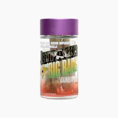 Strap in for lift-off. The Big Bang Rainbow Belts 5-Pack from Jetpacks delivers a powerful punch with infused prerolls that combine premium flower, kief, and oil for an out-of-this-world experience. Bursting with sweet, fruity candy flavor and backed by heavy-hitting hybrid effects, these prerolls are perfect for seasoned smokers looking for serious potency and flavor. Each preroll is precisely rolled and ready to go — no prep, just power.d ready to go — no prep, just power.